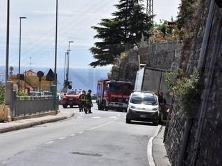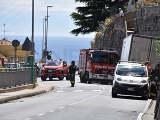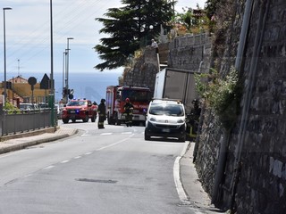 Sanremo: camion trancia tubi del gas, acqua e corrente elettrica, traffico interrotto in via Pascoli e intervento dei Vigili del Fuoco (Foto)