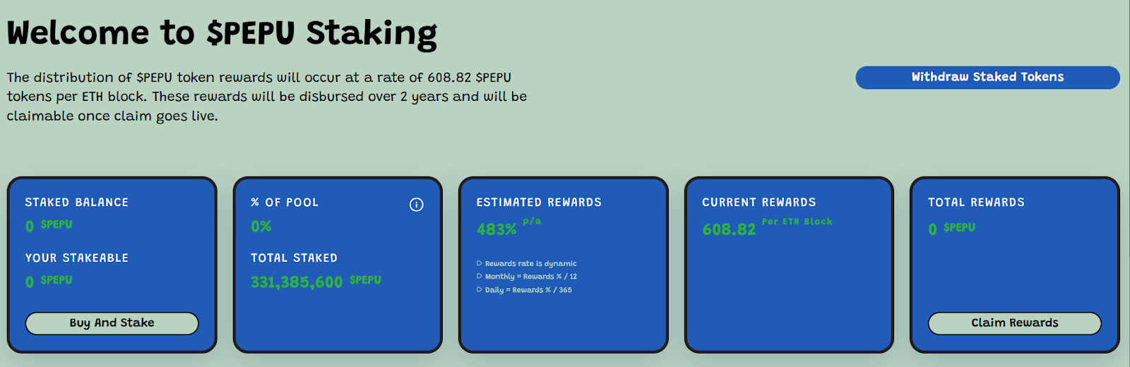 Oltre a funzionare sulla propria chain, Pepe Unchained si distingue per ricompense ingenti che gli altri token Pepe non possono eguagliare. Con un APY del 483%, gli investitori potrebbero quasi raddoppiare i loro token in meno di un mese, preparandosi per un viaggio sulla luna.