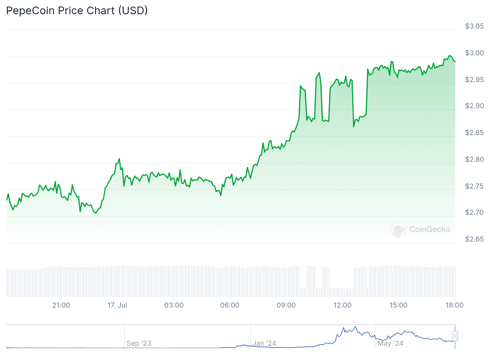 $PEPECOIN ha registrato un picco nelle ultime 24 ore, battendo $PEPE e guadagnando il 10,8% contro il 3%. Lunedì $PEPE era in testa alla classifica delle meme coin, dopo che il venture capitalist Nascent ha perso 3,41 milioni di dollari per raccogliere 141 miliardi di token $PEPE.