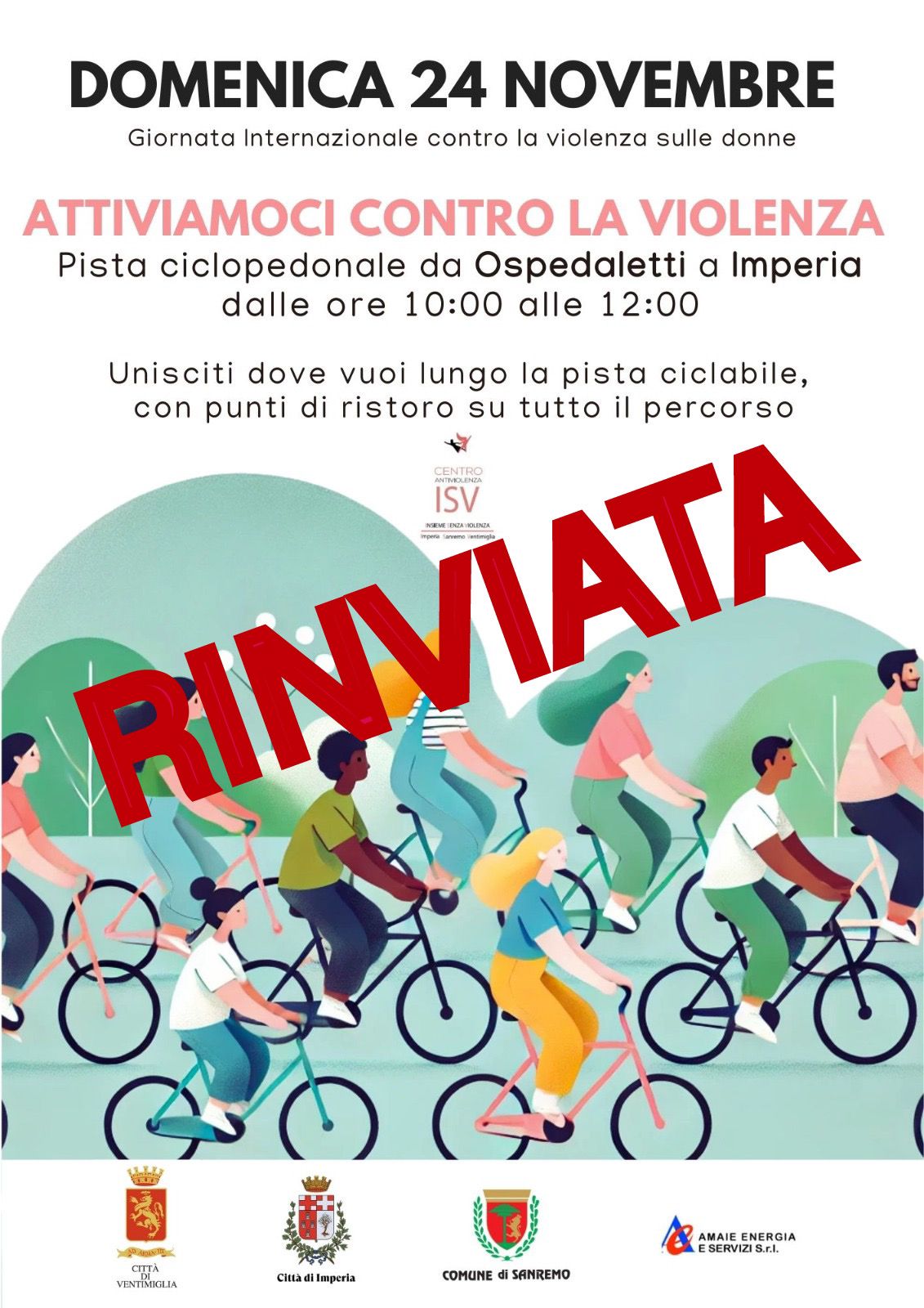 Il maltempo ha fatto desistere gli organizzatori della passeggiata amatoriale in bicicletta, prevista oggi in occasione della ‘Giornata Internazionale Contro la Violenza sulle Donne’.