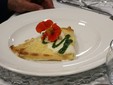 Il primo piatto ha visto come protagonista una crespella gratinata, con cuore di robiola e zucca, arricchita da un pesto di Nasturzio e pinoli tostati. Questo piatto, cremoso e aromatico, si è abbinato alla nota piacevolmente piccante del fiore.