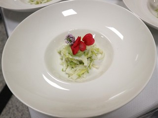 Come antipasto è stata servita un'insalata di seppie cotte a bassa temperatura, delicatamente abbinata all’avocado e ai vivaci fiori di Begonia, portando leggerezza e freschezza al palato.