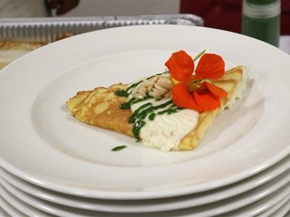 Il primo piatto ha visto come protagonista una crespella gratinata, con cuore di robiola e zucca, arricchita da un pesto di Nasturzio e pinoli tostati. Questo piatto, cremoso e aromatico, si è abbinato alla nota piacevolmente piccante del fiore.