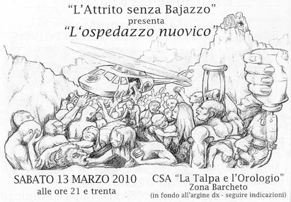 Dopo numerose repliche in città e borghi della provincia di Imperia, con successo di pubblico e critica, specialmente dopo l'ultima performance del Gruppo 'L'Attrito' al Palazzo del Parco di Bordighera, arriva al Centro Sociale La Talpa e l'Orologio di Imperia: 'L'Ospedazzo Nuovico',azione teatrale sul tema della sanità pubblica locale e sul progetto di edificazione di un ospedale unico provinciale.