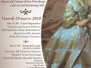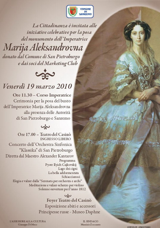 Domani, venerdì 19 marzo, alle ore 11.30, avranno luogo le iniziative celebrative per la posa del momumento all'Imperatrice Marija Aleksandrovna donato dalla città di San Pietroburgo a Sanremo. Il busto verrà collocato proprio sulla passeggiata, tra la statua della Primavera ed il monumento a Garibaldi alla presenza di autorità locali e di San Pietroburgo, che arriverà con una delegazione di circa 40 persone più l'orchestra. Al pomeriggio, alle ore 17.00, avrà luogo il concerto al Teatro del Casinò con musiche di Caijkoskij. L'ingresso è gratuito.