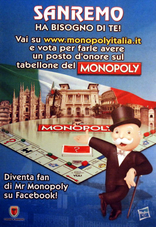 Sanremo è la prima cittŕ italiana a mobilitarsi per conquistare un posto sul tabellone nella nuova edizione di Monopoly Italia, la versione totalmente made in Italy del gioco piů famoso del mondo, dove, per la prima volta, al posto di 'Vicolo Corto' e 'Parco della Vittoria' compariranno i nomi delle cittŕ dello Stivale. E per battere la concorrenza, la Cittŕ dei Fiori, con lo slogan 'Monopolizziamo Sanremo', lancia un vero e proprio Festival del Monopoli, unappassionante sfida che coinvolgerŕ tutta la cittŕ, tra tornei dedicati ai ragazzi delle scuole con un tabellone gigante per la partita vivente in piazza San Siro, giochi nei locali pubblici e una serata di Gala nella casa da gioco piů famosa dItalia, alla presenza Sindaco Maurizio Zoccarato e del Presidente del Casinň Donato Di Ponziano.