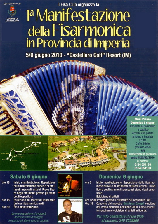 Questo weekend fisarmonica protagonista al Castellaro Colf Resort. Si tratta della prima edizione di questo evento che avrà inizio sabato 5 giugno alle ore 15 con l'esposizione delle fisarmoniche nuove e di strumenti musicali antichi. Oltre alle prove libere degli stumenti presso gli stand degli espositori, alle ore 18 si terrà l'esibizione del Maestro Gianni Martini con una fisarmonica mini.