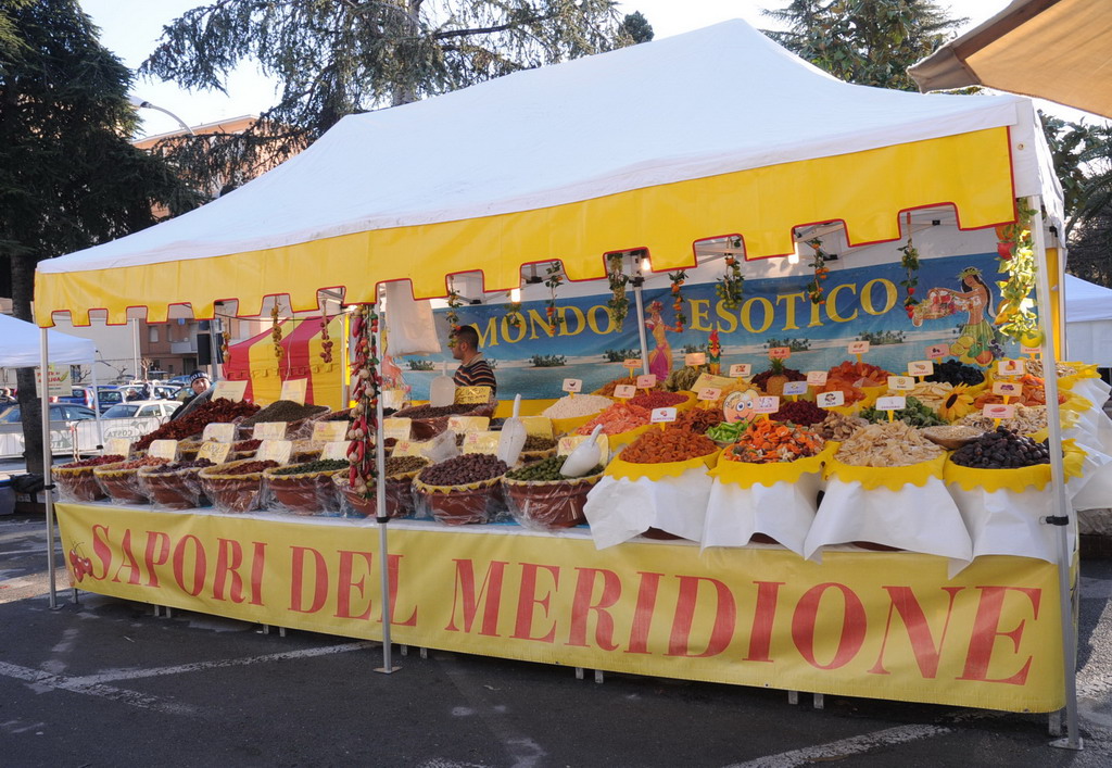 I prodotti alimentari, chiaramente sono in prevalenza rispetto agli altri, qui, infatti, si potranno trovare torte tipiche dalla Toscana, porchetta, tortelli di zucca, salumi dallEmilia Romagna, la Sardegna presenta tutte le sue tipicitŕ, liquirizia biologica della Calabria, Formaggi e salumi tipici, funghi freschi e conservati il burro delle vallate provengono dal vicino Piemonte, il Trentino Alto Adige è presente con tutti i suoi prodotti tra cui spicca lo speck, la Sicilia presenta tutti i dolci al marzapane, i cannoli, gli arancini, i sughi e le conserve specialmente di pesce, Piemonte e Lombardia presentano i vini del Monferrato e quelli dellOltrepň, non poteva certo mancare la Liguria con olio e suoi derivati.