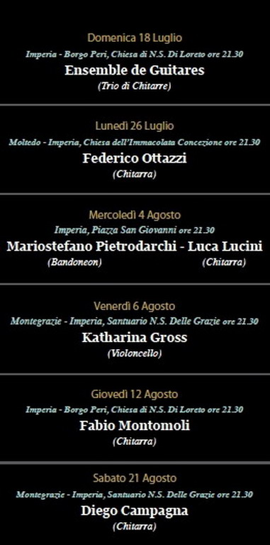 "Abbiamo scelto di nuovo con successo di non concentrare i concerti in un unico luogo - scrivono gli organizzatori - ma di confermare alcuni dei siti più importanti e più caratteristici del nostro territorio nel Comune di Imperia: Piazza San Giovanni, la Chiesa di N.S. di Loreto ad Oneglia e il Santuario di N.S. Delle Grazie a Montegrazie e da quest'anno la Chiesa dell'Immacolata Concezione di Moltedo (il connubio tra questi magnifici luoghi e la musica classica hanno permesso di svolgere nell'ultima edizione una vera e propria opera di sensibilizzazione ottenendo grande successo di pubblico, circa 3500 spettatori in totale), proprio per fare in modo che più persone possibili fossero coinvolte, certi di aver fatto crescere il movimento culturale e musicale dando la possibilità a tutti di poter ascoltare e conoscere grandi personalità musicali e non solo, anche visitando alcuni dei luoghi più suggestivi dalla costa all’entroterra".