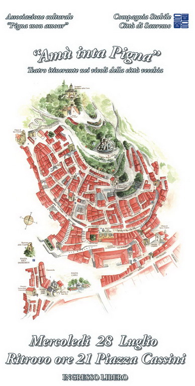 Serata di teatro itinerante per i vicoli della Pigna, mercoledì prossimo con la compagnia Stabile Città di Sanremo, in collaborazione con l'associazione 'Pigna mon amour'. Lo spettacolo, che avrà inizio a partire dalle 21 e prevede la partenza di ogni gruppo ogni 15 minuti circa, sarà l'occasione per scoprire o riscoprire gli angoli più caratteristici della città vecchia, dove saranno collocati gli interventi teatrali degli attori della compagnia: la 'funtanassa', dove Gianni Modena reciterà Dante (in italiano e nella traduzione in sanremasco di Aldo Bottini), piazza cisterna, piazza san Costanzo, piazza santa Brigida.