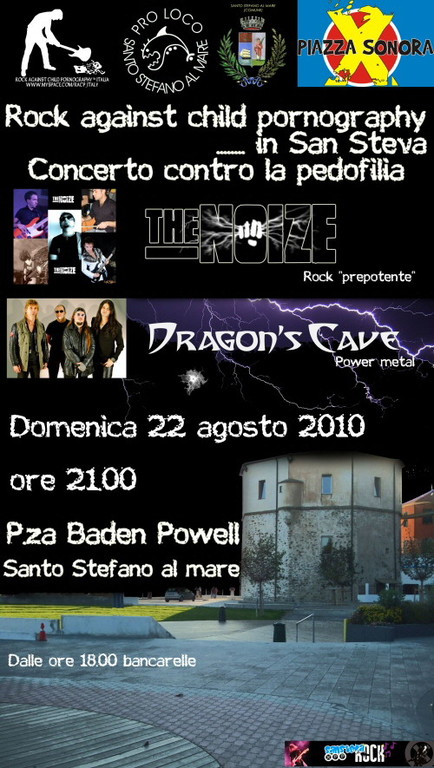 Le bancarelle si aprono alle 18 e alle 21.00 sul palco saliranno i 'The Noize' (di Sanremo) e i 'Dragon's Cave' (di Milano). L'evento ha il patrocinio del comune di Santo Stefano al Mare, ed è organizzato in collaborazione con la Pro Loco, Piazza Sonora e Sansteva Rock. I saluti da parte del comune porterà Maria Teresa Garibaldi, l'Assessore al Turismo. A Sanremo, due anni fa è nato il 'Team Italy' dell'organizzazione 'Rock Againsta Chil Pornography'. E' un gruppo di persone sanremesi e romane che vogliono diffondere il silenzioso argomento della pornografia infantile, la pedofilia e lo sfruttamento dei bambini, con lo scopo di sensibilizzare il maggior numero di persone, in tutta Italia.