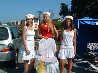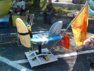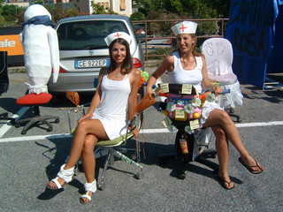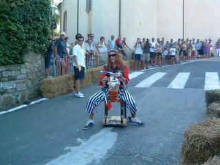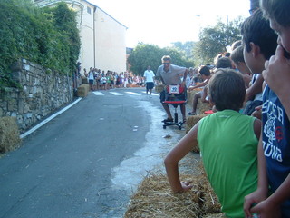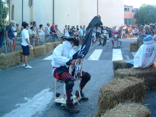 Grande partecipazione di pubblico alla '69° SanBa's Carega Cup', competizione goliardica di discesa su sedia da ufficio, svoltasi oggi a San Bartolomeo al Mare. 21 gli equipaggi partecipanti, tutti uomini, che si sono lanciati giù dalla discesa di via del Santuario, in località La Rovere, con delle ‘careghe’ (sedie) opportunamente modificate, per circa 120 metri. Il primo posto se lo è aggiudicato il gruppo di 4 ‘Pirati’ di Ventimiglia, il secondo posto è andato al pub ‘Il solito posto’ di Diano Marina, terzi i Bagni Ester di San Bartolomeo al mare. Si sono visti tanti ruzzoloni, ma fortunatamente nessun ferito e neppure una sbucciatura. I concorrenti, infatti, erano tutti ben protetti con caschi ed abbigliamento adatti alla competizione più simpatica dell’estate.