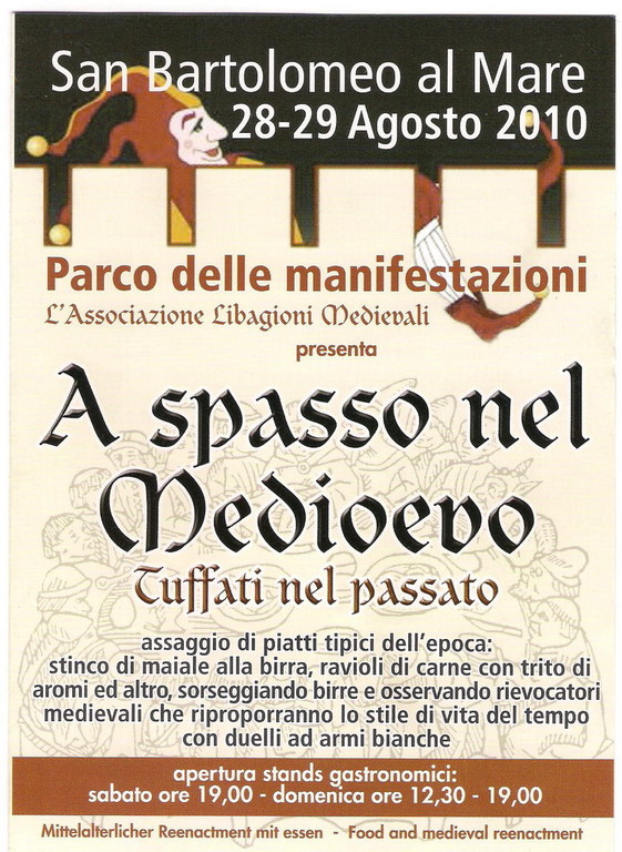 Si svolgerà sabato e domenica, a San Bartolomeo al Mare, presso il Piazzale Olimpia, la manifestazione “A Spasso nel Medioevo”, una sagra decisamente fuori dal comune. In primis, i piatti proposti non saranno le solite trenette al pesto e costine varie, ma la riproposizione di Antiche Ricette Medievali, unite alla presenza di più di una ventina di rievocatori che pianteranno le loro medievali tende all’interno dell’Area delle Manifestazioni, e dalle 19 (apertura degli stands gastronomici) allieteranno la gente che starà gustando cibi dell’Epoca con birre di qualità con spaccati di vita dei tempi che furono con tanto di duelli ad Armi Bianche e Giostre con Cavalli (è infatti prevista anche la presenza di Cavalli e Pony). Inoltre per gli amanti dell’Artigiano, saranno presenti diversi stands per poter acquistare vestiti e chincaglierie dell’Epoca direttamente dagli artigiani produttori. Da segnalare l’insolita apertura anche all’ora di pranzo alla Domenica, per un pranzo decisamente fuori dal comune.