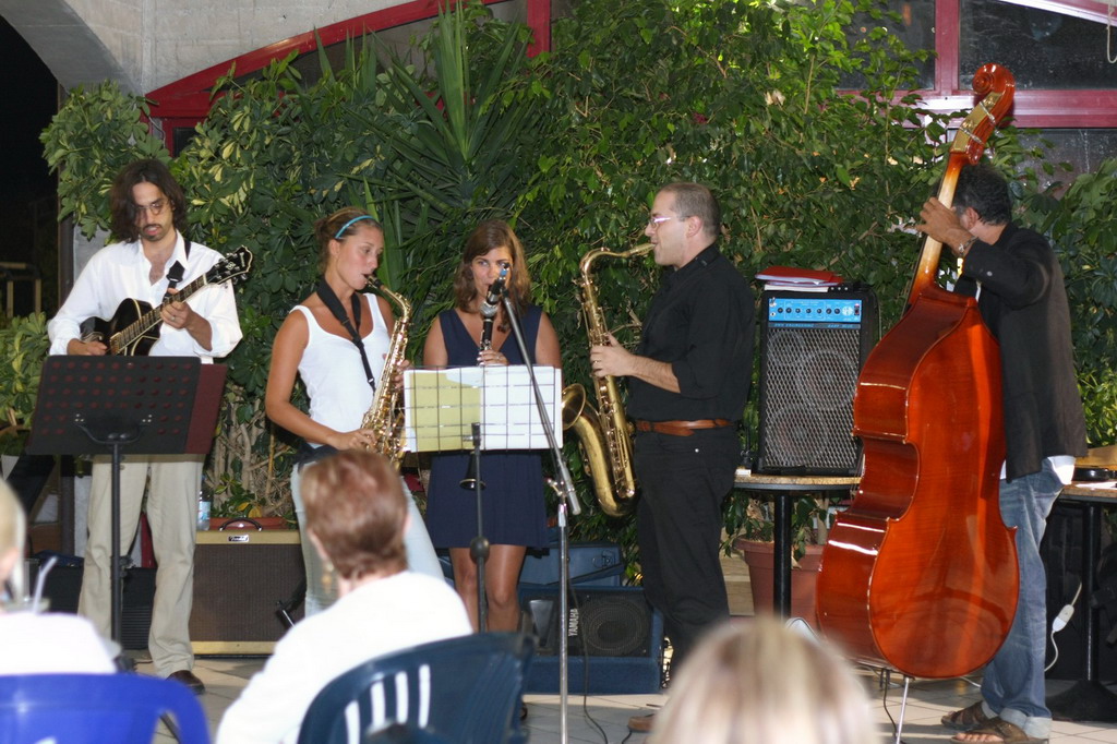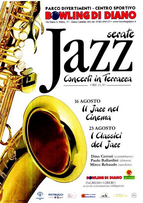 Hanno riscosso un notevole successo le due serate dedicate al jazz organizzate presso il Bowling di Diano, a Diano Castello, il 16 e 23 agosto scorsi. La prima edizione di "Concerti in terrazza", con protagonisti il saxofonista Mirco Rebaudo, il chitarrista Paolo Ballardini ed il bassista Dino Cerruti, ha pienamente appagato le attese di tutti gli appassionati presenti, alcuni dei quali stranieri. La prima serata aveva come tema "Il jazz nel cinema", la seconda "I classici del jazz", ma i tre bravi e talentuosi musicisti durante i loro concerti hanno spaziato su più fronti, spesso improvvisando e stupendo a più riprese il pubblico per la naturalezza con cui si sono esibiti. Nel corso del secondo appuntamento il trio ha coinvolto, per un paio di brani, anche due giovani ragazze (sax e clarinetto), dando vita ad una simpatica performance. "Ringrazio e faccio i complimenti a Rebaudo, Ballardini e Cerruti - sono le parole di Giuseppe Leotta, direttore del Bowling -. Per noi è stato un onore ospitare artisti del loro calibro, non è cosa da tutti i giorni. Sono state due serate davvero gradevoli. Speriamo di poter ripetere l'iniziativa anche in futuro, sicuramente la prossima estate. Non è detto, comunque, che si possa proporre qualcosa di musicale presso la nostra struttura anche nel periodo invernale".