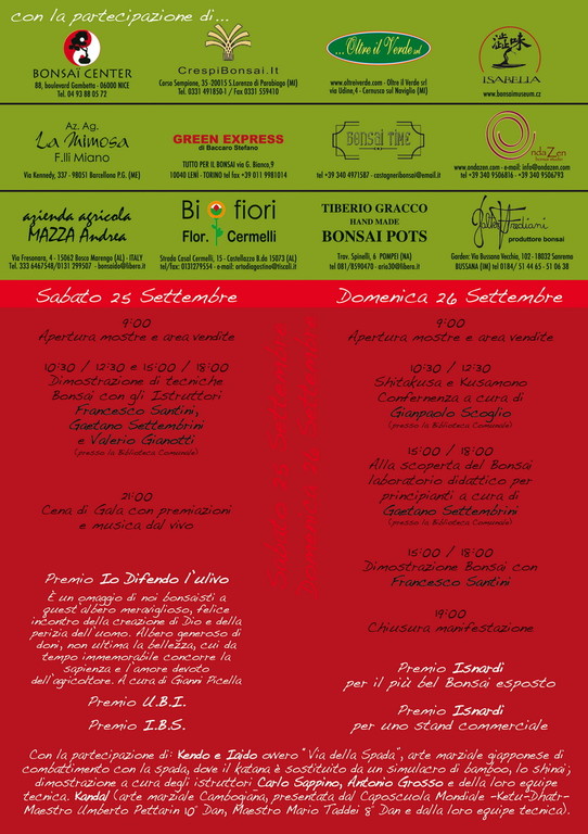 Ribadiamo il concetto - concludono - che la nostra arte debba essere svolta a contatto con il pubblico che non la conosce; il rinchiudersi in un hotel, in un centro congressi, il far pagare il biglietto per assistere alle dimostrazioni non fa che allontanare i 'curiosi' che sono la nuova linfa di cui hanno bisogno i bonsai club".