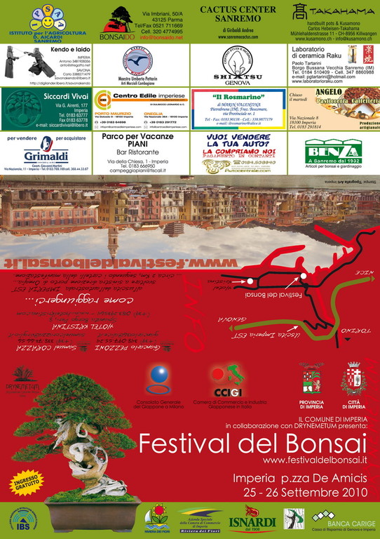 Sabato 25 e domenica 26 settembre, in piazza de Amicis ad Imperia, ritorna la manifestazione 'Festival del Bonsai 2010' che quest'anno sarà arricchita dall’esposizione di circa 40/50 bonsai e suiseki di livello internazionale. L'evento è nato dalla collaborazione tra il Drynemetum Associazione Culturale Bonsai , il Comune di Imperia e l’Oleificio Isnardi e gode anche quest’anno dei patrocini della Provincia di Imperia, dell’IBS, dell’UBI, del Consolato del Giappone in Italia e della Camera di Commercio e Industria Giapponese in Italia.