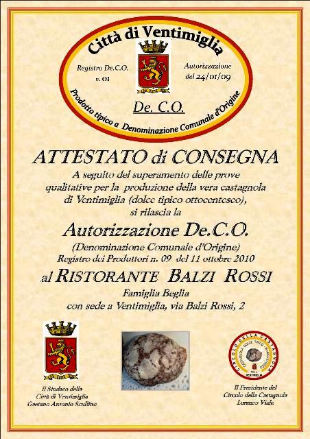 La castagnola, dopo aver ottenuto il riconoscimento di prodotto tipico con la formulazione di un disciplinare di produzione e grazie al lavoro svolto dal 'Circolo della Castagnola', a cui è demandata la promozione e il controllo del disciplinare di produzione, ha avuto un successo crescente che vede nell’attenzione da parte di uno dei migliori ristoranti della zona, un riconoscimento qualitativo e prestigioso inaspettato. La consegna dell’attestato è avvenuto in forma ufficiale nell’ufficio del Sindaco, alla presenza dei consiglieri comunali Paolo Giugiario e Mauro Merlenghi che dall’inizio hanno seguito la pratica della castagnola De.C.O., del Presidente del Circolo della Castagnola Lorenzo Viale, i titolari del ristorante Balzi Rossi: la mitica Giuseppina Beglia e la nipote Valentina, dello chef Alfio Gadaldi e della valente collaboratrice Elisa Molinari.