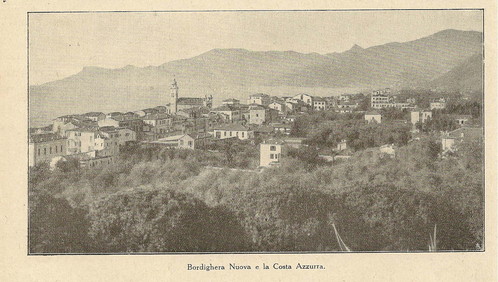 “Sta dinnanzi l’immensità del mare liscio come uno specchio e splendido delle tinte cangianti di un collo di colomba, il verde lucente, il porporino scuro, il soave oltremare, l’azzurro cupo di una lama di brunito acciaio, talora scintillante al sole come diamanti, talora ripiegantesi a mo’ di nastro in rete di nivea spuma…..” così inizia il testo dedicato alla città di Bordighera ed accompagnato da una fotografia, che raffigura la parte “nuova” della città e sullo sfondo la Costa Azzurra.