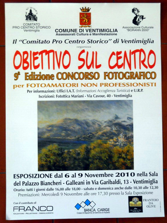 Verrà inaugurata domani mattina alle 10,30, presso Palazzo Biancheri-Galleani di Ventimiglia Alta (via Garibaldi 13) la mostra delle foto partecipanti al Concorso 'Obiettivo sul Centro'. Il regolamento cliccando QUI.