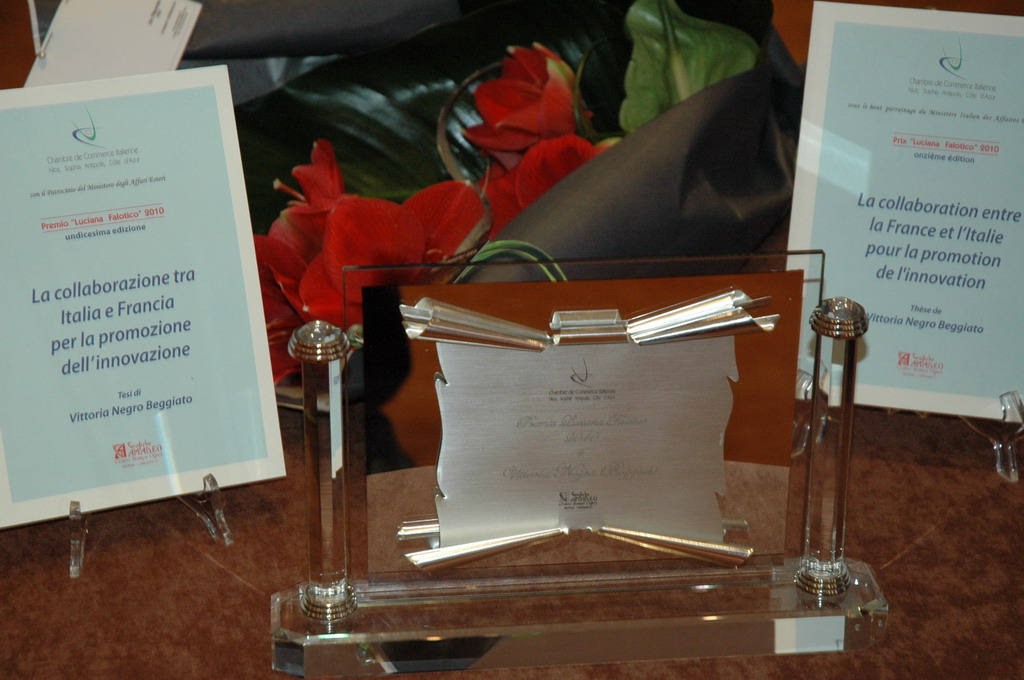 Quest’anno, il Premio Luciana Falotico è stato consegnato alla Dott.ssa Vittoria Negro Beggiato per la sua ricerca presso la facoltà di Economia dell’Università di Torino, intitolata 'La cooperazione tra la Francia e l’Italia per la promozione dell’innovazione'. La tesi è stata presentata dai professori che hanno seguito la dottoressa Negro Beggiato nel suo lavoro di ricerca: Giuseppe Tardivo e Stefano Bresciani, entrambi docenti di economia presso l’università di Torino.