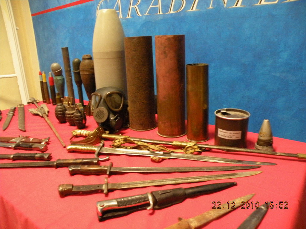 Aveva in casa: bombe di vario calibro, 5 bombe a mano, 10 baionette, maschera antigas, vari proiettili parabellum anche di tipo tracciante, 2 metaldetector, 2 pugnali.