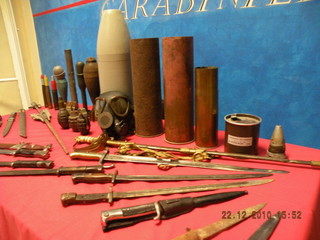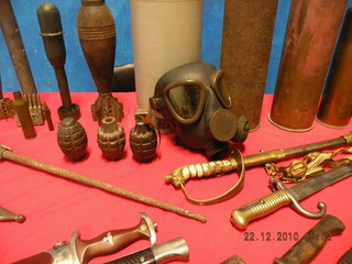 Aveva in casa: bombe di vario calibro, 5 bombe a mano, 10 baionette, maschera antigas, vari proiettili parabellum anche di tipo tracciante, 2 metaldetector, 2 pugnali.