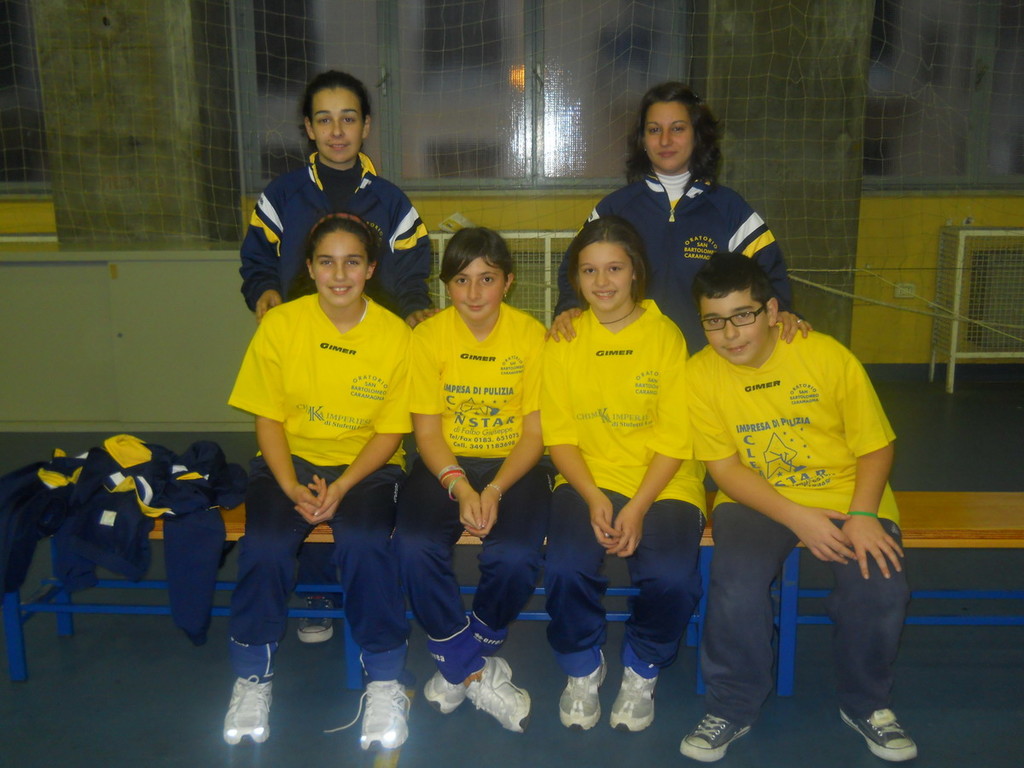 Ecco la formazione inedita dell'A.S.D. San Bartolomeo Caramagna che si appresta ad affrontare il campionato provinciale Under 12. A parte i due veterani Federico Zavaglia e Alessia Raimondo che già da qualche anno militano nella società sportiva si tratta di elementi nuovi: Alice Bendinelli, Gaia Fontana, Martina Sutera e Rebecca Nocentini, che da ottobre scorso si stanno duramente allenando abilmente seguite dalle due giovani allenatrici Martina Basso e Giorgia Gusciglio per recuperare il tempo perduto ed essere in grado di affrontare le dure prove che li attendono. Il gruppo non numeroso ma molto amalgamato nonostante il poco tempo passato assieme si allena al martedi alla Maggi e al sabato alla palestra Viesseux dello scientifico assieme ai compagni più grandi dell'Under 14. Alla squadra vanno il saluto e l'augurio del presidente don Gianni Estienne.