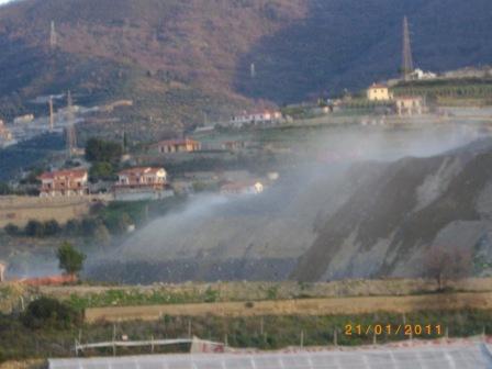 "Le foto allegate, sono l'esempio dei controlli in rispetto dell'ambiente, così tristemente di moda ultimamente. Le polveri non seguono il confine naturale della cava-discarica di Castellaro, ma sconfinano anche in quella temporaneamente ferma di Taggia, fino a distribuirsi senza regole e leggi sulla valle.
