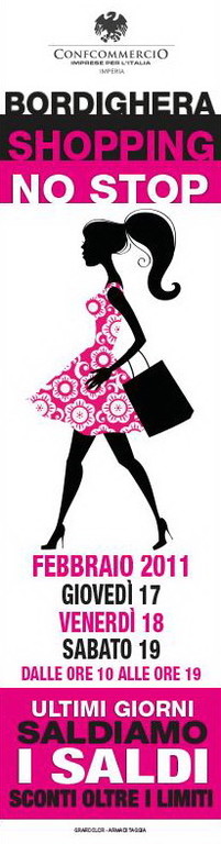 Domani scatta l’iniziativa "Bordighera shopping no stop" promossa dalla confcommercio della città delle palme. L'iniziativa si protrarrà sino all’ultimo giorno dei saldi ovvero sabato 19 febbraio. L'invito dalla confcommercio è quindi di "usufruire degli ultimi giorni per non perdere questa opportunità di sconto sui prodotti invernali che i commercianti di bordighera proporranno ai visitatori". In questi due giorni di apertura no stop, i negozi saranno aperti dalle ore 10 alle ore 19. Infine sabato alle ore 17 è previsto in centro città il concerto del gruppo musicale “the mad”.