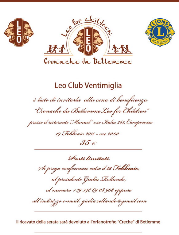 Cena benefica promossa dai giovani lions del Leo Club Ventimiglia. Appuntamento per sabato 19 febbraio alle 20 presso il Ristorante Manuel di Camporosso. Costo della partecipazione 35 Euro.