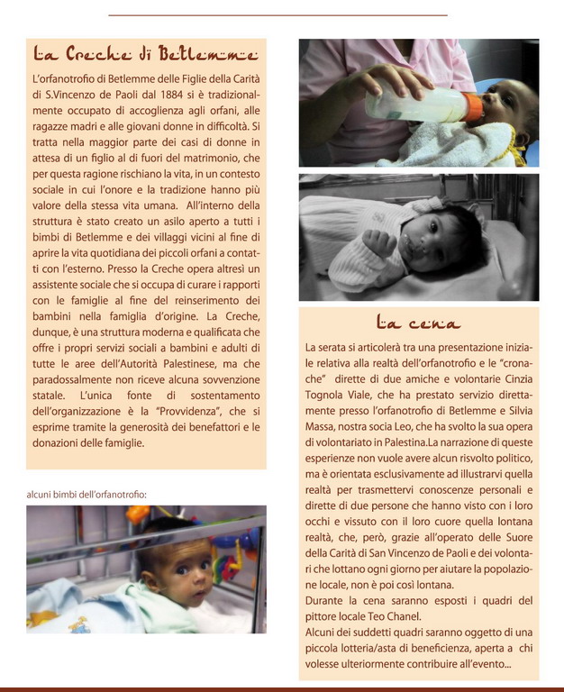 La cena, con lo scopo di raccogliere fondi da devolvere all'orfanotrofio "La Creche" di Betlemme delle figlie della Carità di S. Vinenzo de Paoli, si articolerà tra una presentazione iniziale relativa alla realtà dell'orfanotrofio seguita dai racconti delle esperienze sul campo (con foto e videoproiezioni) dirette da due amiche e volontarie Cinzia Tognola Viale e Silvia Massa. Inoltre nella sala verranno esposti i quadri del pittore di Bordighera Theo Chanel, pittore visionario (tra surrealismo e cubismo). L'artista ha inoltre gentilmente messo in palio per la lotteria, che si terrà a fine cena, tre quadri tra cui uno raffigurante proprio Beltemme, che ha appositamente creato per la serata.