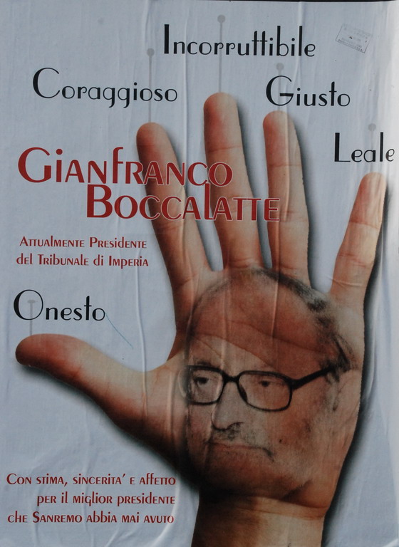 Il manifesto è stato fatto stampare da un gruppo di conoscenti del magistrato e riporta l’immagine di una mano con il viso di Boccalatte. In fondo la scritta: “Con stima, sincerità ed affetto per il miglior presidente che Sanremo abbia mai avuto”.
