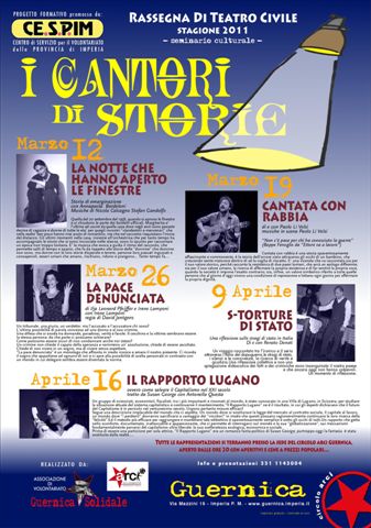 Sabato 12 marzo 2011 avrà inizio ad Imperia la quinta rassegna di Teatro Civile denominata ‘I Cantori di Storie’, pogetto formativo promosso dal CESPIM, Centro Servizi al Volontariato della Provincia di Imperia, in collaborazione con l'Associazione di Volontariato Guernica Solidale e il Circolo Arci Guernica e Arci Solidarietà A.Lipari. Tutte le rappresentazioni si terranno al Circolo Arci Guernica in via Mazzini 15 di Imperia e saranno precedute, per chi fosse interessato, da una cena sociale alle ore 20.00 (informazioni e prenotazioni 331 1143004. Ingresso riservato ai Soci Arci).