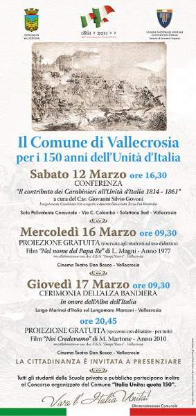 Le iniziative organizzate dall'Assessorato alla Cultura del Comune di Vallecrosia e coordinate dall'Assessore delegato Armando Biasi, sono iniziate sabato 12 marzo, alle ore 16.30, presso la Sala Polivalente comunale di Vallecrosia (Via C. Colombo solettone sud), con la conferenza 'Il contributo dei Carabinieri all'Unità d'Italia 1814 - 1861' tenuta del Luogotenente Carabinieri in congedo Cav. Giovanni Silvio Govoni.