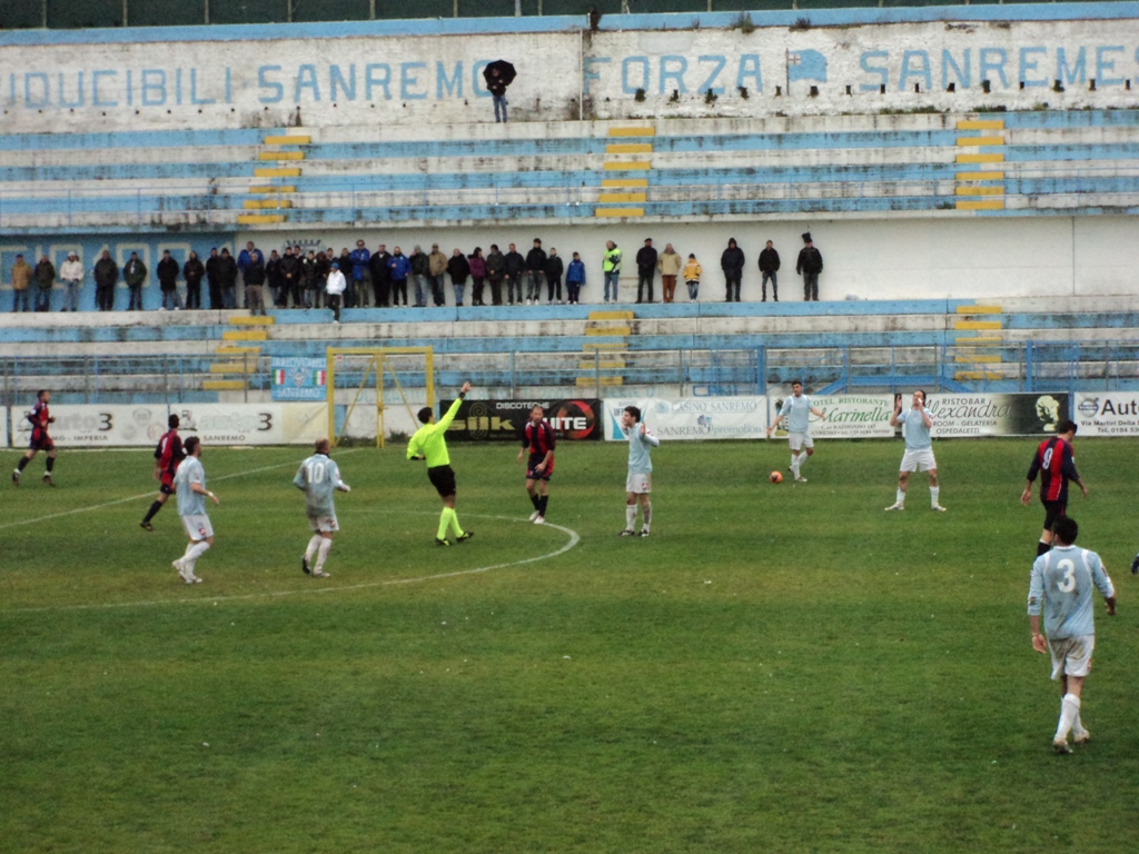 Un inizio di primo tempo pimpante per gli uomini di Stragapede che mettono subito alle corde i piemontesi. Al 4' pericoloso uno-due tra Sifonetti e Pippi che per un nulla mancano la marcatura alle spalle di Serena. Sei minuti dopo ancora Sanremese con un tiro cross di Sifonetti deviato in corner. Ancora Sanremese pericolosa al 18', Sifonetti si invola verso la porta ma il signor Benassi ferma tutto per offside. Da qui in poi pochi sussulti, da parte di entrambe le squadre, le manovre macchiose e un poco di nervosismo hanno preso il sopravvento. infatti il nervosismo si fa sentire, Sterni stende a palla lontana Gomes ma per l'arbitro è tutto ok... Al 38' incursione di Miale in area su cross di Sifonetti ma va sopra la traversa e un minuto dopo i biancoazzurri insistono sulla corsia di sinistra, Bosio mette un pallone in area ma Serena c'è. Nei minuti finali del primo tempo, i padroni di casa prendono più brio e assaltano ripetutamente l'area degli orafi ma invano. Al 44' si vede la Valenzana con un'azione solitaria di Bachlechner che scarta due difensori ma il suo tiro va a lato. Al 45' tiro cross di Bosio che sibila il palo e su questa azione si concludono i primi 45 minuti di gioco. Sul risultato ad occhiali si va a bere un thè caldo.