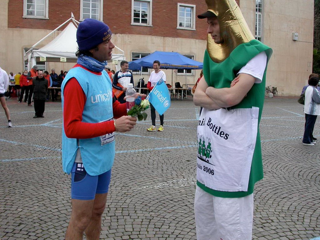 Le 4 rose, condotte nella competizione sono state un grosso ostacolo in quanto ostacoleranno l'atleta nei movimenti delle braccia (provate a correre 3 minuti con il telefono in mano...). I colori dei 4 fiori compongono le bandiere dei 3 strati che sono stati attraversati dalla gara (unica al mondo ad attraversare 3 paesi).