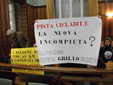 La seduta del consiglio comunale si è aperta con la protesta, assolutamente pacifica, dei simpatizzanti del Beppe Grillo Meetup che hanno esposto alcuni cartelli con oggetto la pista ciclabile. I messaggi riguardavano in particolare i soldi spesi e l'assenza di illuminazione a causa della mancanza di fondi da destinare alla manutenzione.