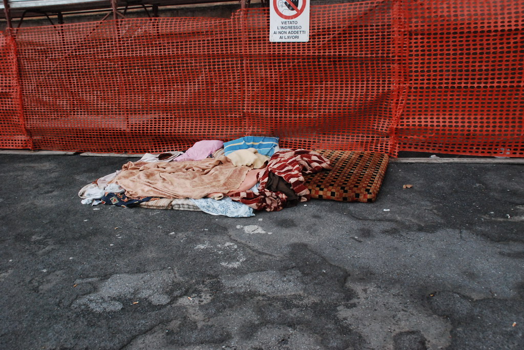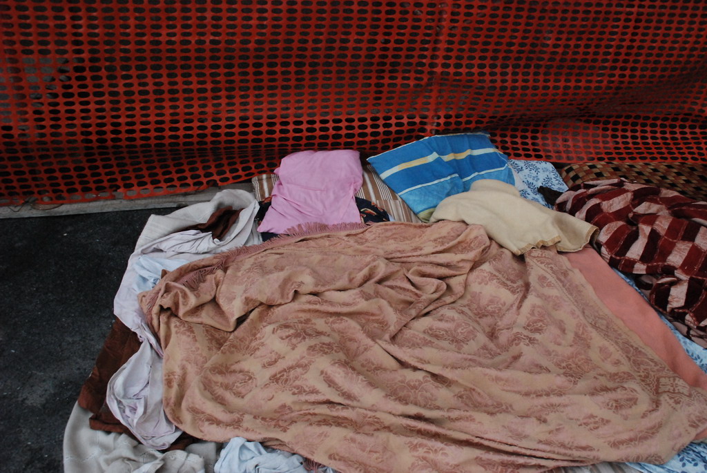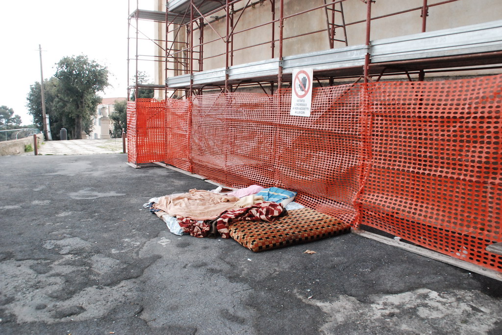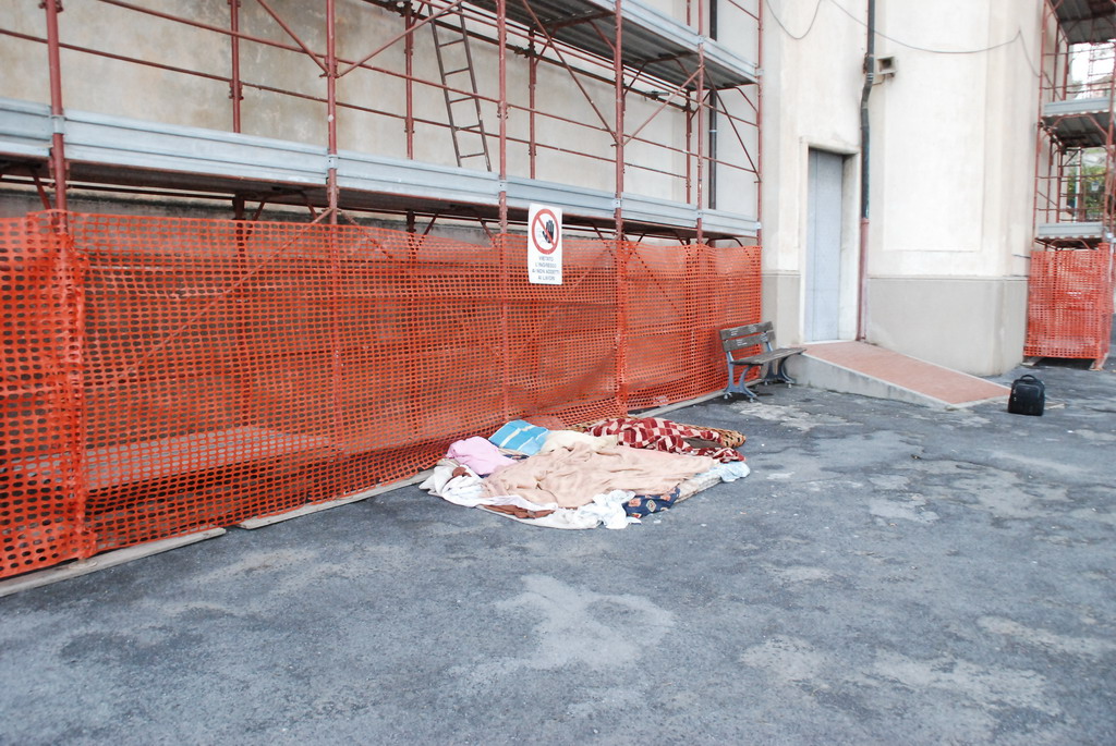 Sanremo: un bivacco con materassi e coperte a fianco della Madonna della Costa