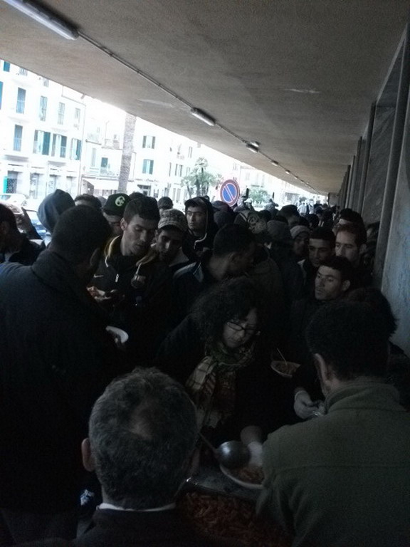 Iniziativa della Cgil che ha distribuito, attraverso i volontari dell''Auser Filo d'Argento, un pasto caldo alle centinaia di immigrati che stanno vivendo alla stazione ferroviaria di Ventimiglia.