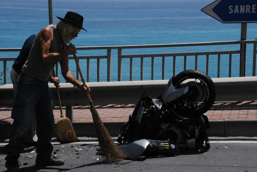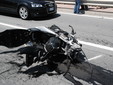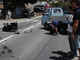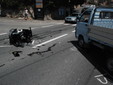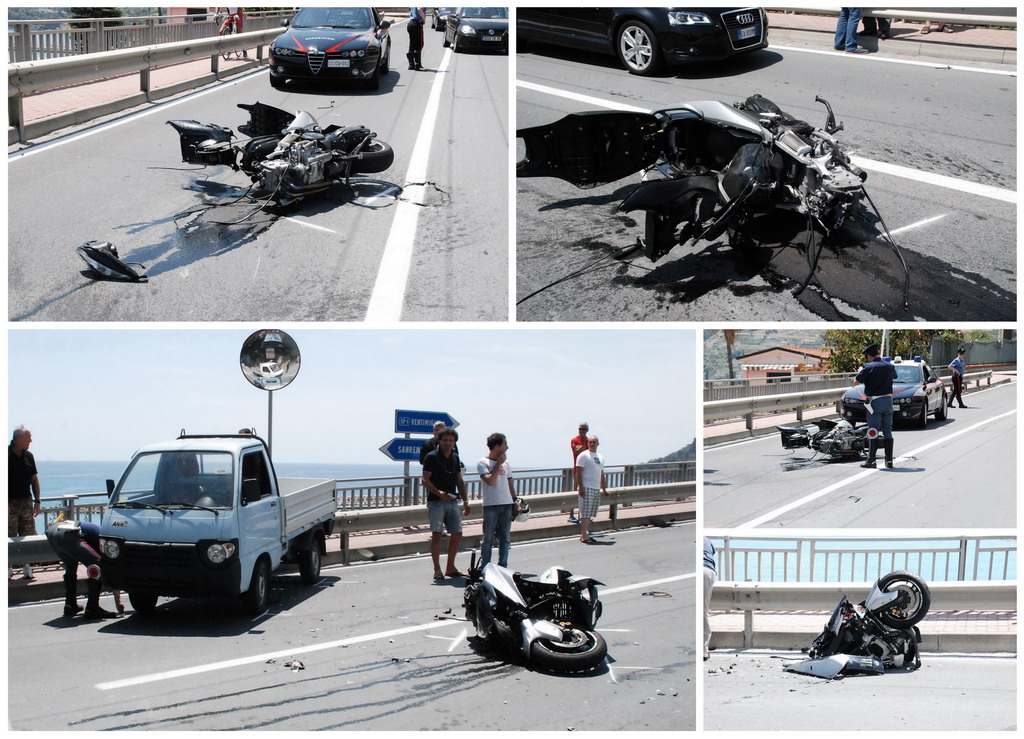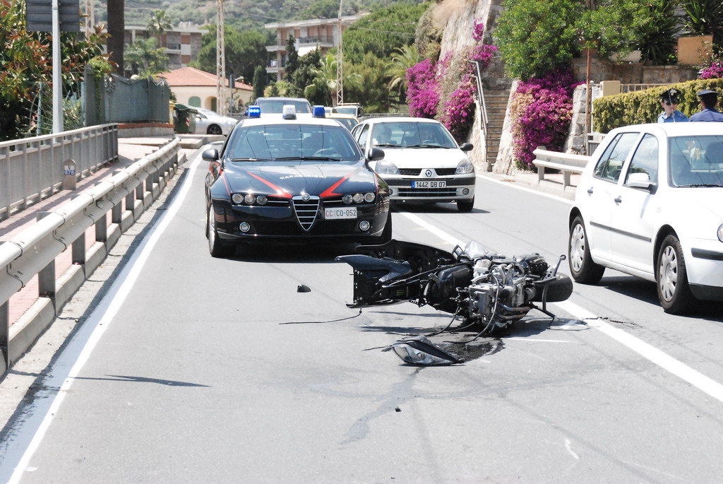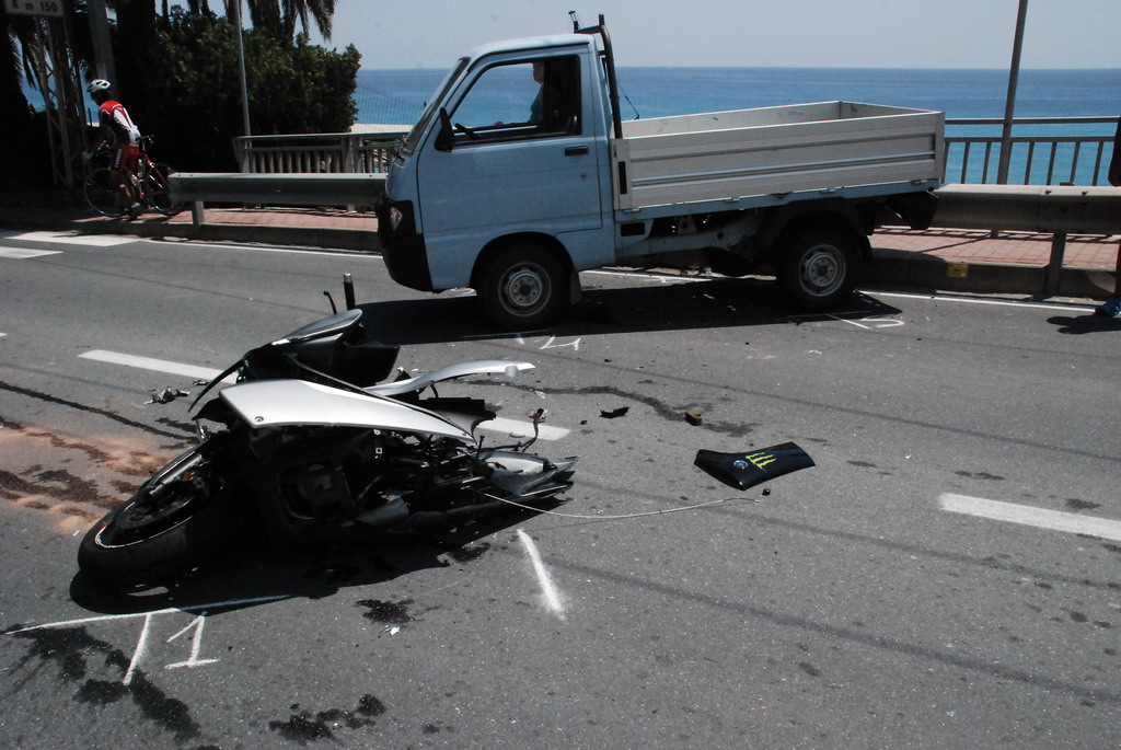Il TMax sul quale viaggiava si è letteralmente spezzato in due, nell'impatto con un Piaggio Porter che stava svoltando da strada Valdirodi.