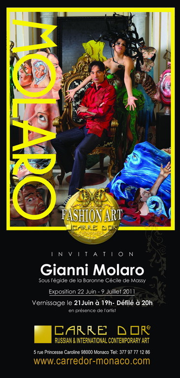 La Galleria Carré Dore di Monaco presenta dal 21 giugno fino al 9 luglio l'Esposizione di Gianni Molaro noto Stilista Artista campano, il quale ha saputo imporsi sulla scena internazionale per la sua innovativa "Fashion Art', perfetta espressione di una nuova tendenza da lui teorizzata e proposta, sillogismo mirabile tra Arte e Moda, e per le sue surreali Fashion Art Performance, basate sulle sue creazioni. Le opere di Gianni Molaro sono presenti in prestigiose collezioni private e sono fonte di ammirazione da parte di numerosi critici d'arte.