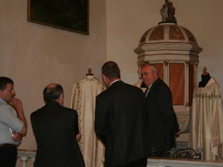 S.E. Mons. Bernard Barsi Arcivescovo di Monaco ha potuto ammirare dal vivo i due modelli di casule che saranno indossati dai concelebranti, un tipo più prezioso per i Vescovi e quelle normali per i Sacerdoti monegaschi, oltre alla dalmatica per i Diaconi. L’Arcivescovo di Monaco ha dimostrato grande apprezzamento per il risultato del lavoro artigianale svolto e ha visto come dal disegno di bozzetto si è arrivati al paramento finito. I disegni originali di Bianca Maria Porri sono stati esposti assieme ai campioni della “tela Grimaldi” realizzata per l’occasione. Durante l’incontro è stato presentato un breve filmato che illustra le varie fasi del lavoro di preparazione.