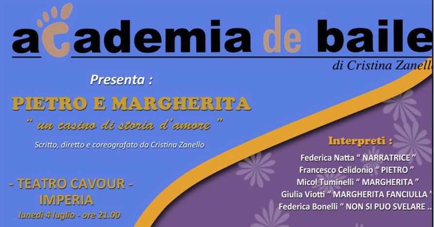 La scuola di danza 'Academia de baile' di Cristina Zanello presenterà, lunedì prossimo al Teatro Cavour di Imperia, con inizio alle 21, il musical 'Pietro e Margherita, un casino di storia d’amore'. Lo spettacolo, ideato, scritto e coreografato dalla stessa Cristina Zanello alternerà momenti di ballo ad altri di recitazione e sketch umoristici, nei quali i protagonisti saranno gli allievi della scuola che nel corso dell’anno hanno frequentato i corsi di salsa principianti, intermedi, avanzati, break on two 1° e 2° livello e tango argentino.