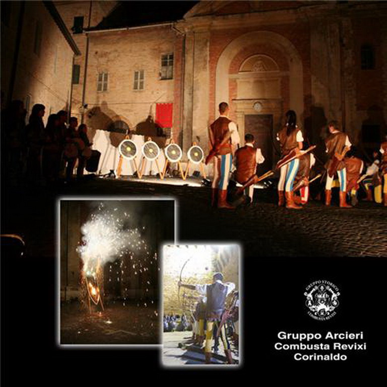 Questa sera si inizia con l'esibizione del gruppo Arcieri. Parte del Gruppo Storico Città di Corinaldo sin dai primi anni 80, nasce con lo scopo di favorire in Italia e all'estero la conoscenza della cultura medievale e rinascimentale organizzando palii, tornei ed esibizioni con archi storici senza l'utilizzo di mirini di precisione o di bilancieri, facendo rivivere nelle vie e piazze un angolo di storia. Gli Arcieri di Corinaldo si esibiscono inoltre in avvincenti gare di abilità come il tiro al bersaglio classico, il tiro al piattello con caduta di coriandoli, il tiro agli anelli colorati, il tiro al piatto nascosto, il tiro al piatto su torre umana. In occasione di spettacoli notturni, gli Arcieri si esbiscono in suggestivi lanci di frecce infuocate e dardi esplosivi che, causando l'accensione di spettacolari fuochi pirotecnici, catturano inevitabilmente e stupiscono il pubblico presente.