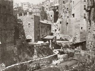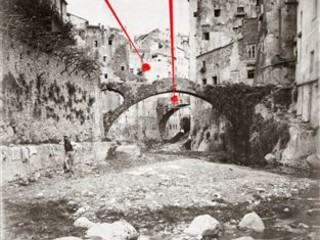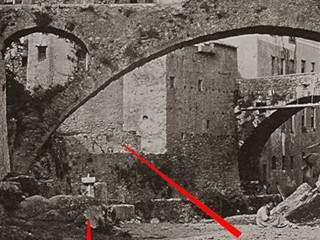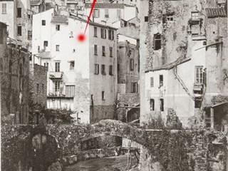 Foto 1- L'alveo del torrente S.Romolo coi fabbricati frontistanti. A sinistra l'Isola Abas, a destra : quartiere di Villanuova (francesismo - sta per Città nuova), i ponti Borea e Ciapela.