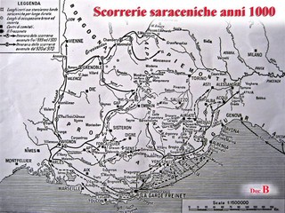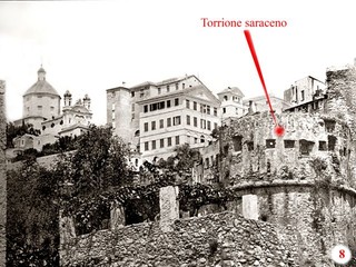 Sulla Torre saracena il Vinzoni sulla premessa alla cartografia della Città scrive: ' L'anno 1124 vi fabricarono una Torre per diffesa contro saraceni'. Lo Statuto della città di S.Romolo datato 1435 (capo 12 De armis non portandis) da una descrizione alquanto puntuale sullo insediamento abitativo che dal Castello scende alla Via Palazzo sulla quale era prospicente il Palazzo comunale che ha dato il nome alla via. I quartieri di Villanuova, del piano con la Chiesa di S.Siro, di Via Palazzo erano già stati costruiti. La TORRE è attorniata de case. Resta quale ricordo difensivo dell'epoca Saracena. Il 'Castrum' era arrocato su di un costone tra due incisione vallive, il torrente S.Francesco a levante e il torrente S.Romolo a ponente altrimenti nominati. La terra che dalle mura, costituite da alti fabbricati, scendeva ai torrenti si chiamava Isola. Isola bona era definita quella di levante, Isola Abas quella sul ponente. L'Isola di levante era più ripida, quella di ponente più pianeggiante. La Torre nell'anno 1130 (datazione Caffaro) venne posizionata sull'Isola di ponente alla base del 'Castrum' per poter dominare in tale modo l'accozzaglia piratesca saracena che risaliva il greto del torrente S.Romolo per assaltare il Castrum.