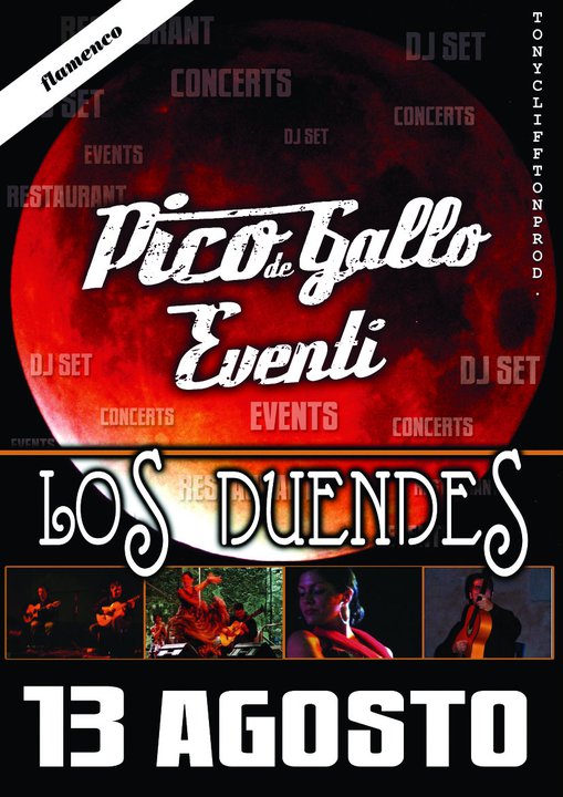 Questa sera, al Pico de Gallo Sanremo, cena in riva al mare con i Los Duendes. Un'elegante cena serale con uno spettacolo originale, flamenco, ballo e virtuosismi chitarristici di Marco Galvagno, uno dei più talentuosi musicisti d' Italia.