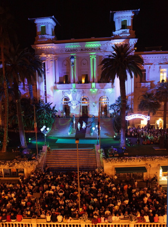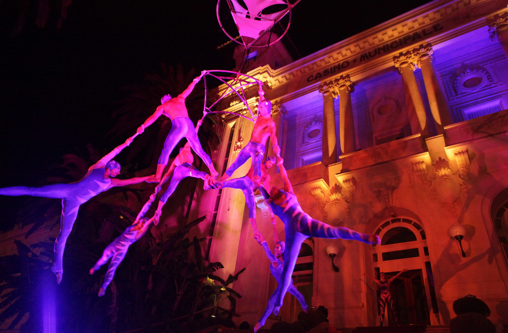 La compagnia guidata da Alessandro Pietrolini ha presentato alcune significative performances di acrobatica aerea tratte dal loro ultimo spettacolo 'Osa', adattandole alla facciata esterna dell'edificio sanremese e alla conformazione dei tre piani che lo compongono.