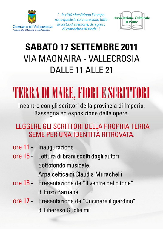 "Dopo il rinvio del 4 settembre e la mancata effettuazione della Mostra di Libri per domani 11, finalmente una data certa: sabato 17 settembre dalle 11 alle 21 con lo stesso programma (come da locandina in basso) e sempre in via Maonaira a Vallecrosia. Le case editrici Zem, Philobiblon ed Atene, presenteranno le opere degli autori imperiesi in catalogo". Lo comunica Mac Fiorucci, organizzatore della manifestazione, che spiega: "Inoltre vi saranno due rassegne, una dedicata agli scrittori scomparsi, (Biamonti, Orengo, Seborga, Biancheri, Lanteri...), l’altra, a cura dell’Istituto Storico di Imperia, dedicata alle opere riguardanti la Resistenza e la storia contemporanea.