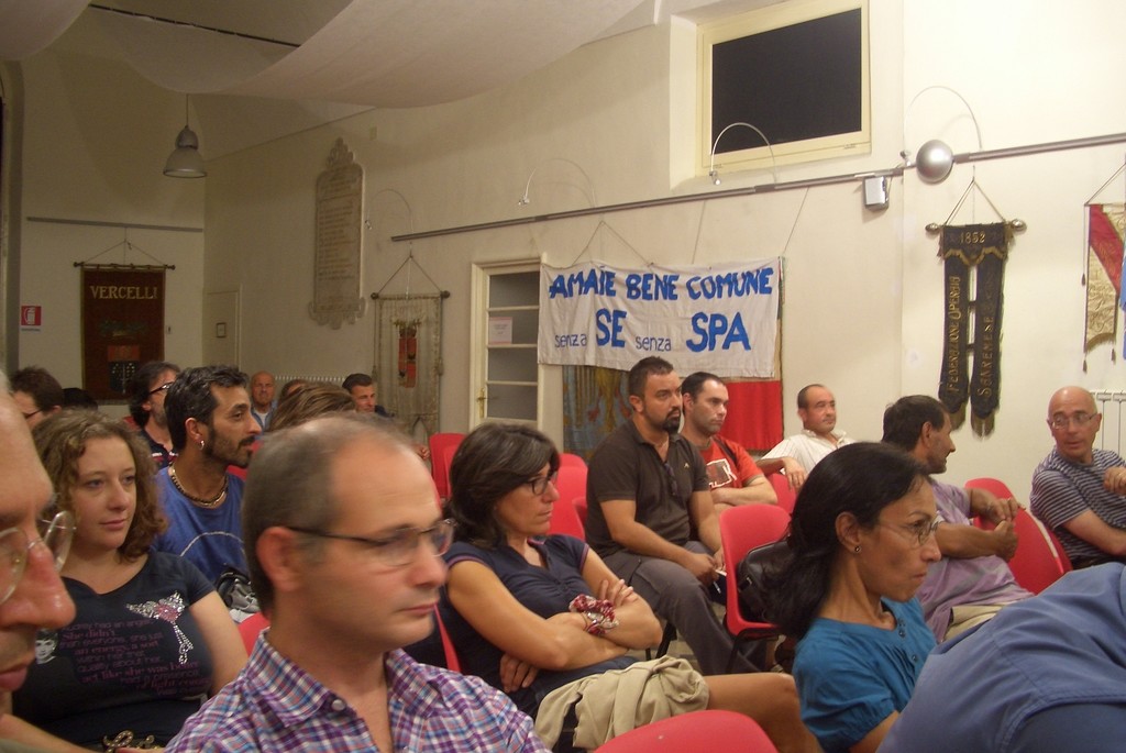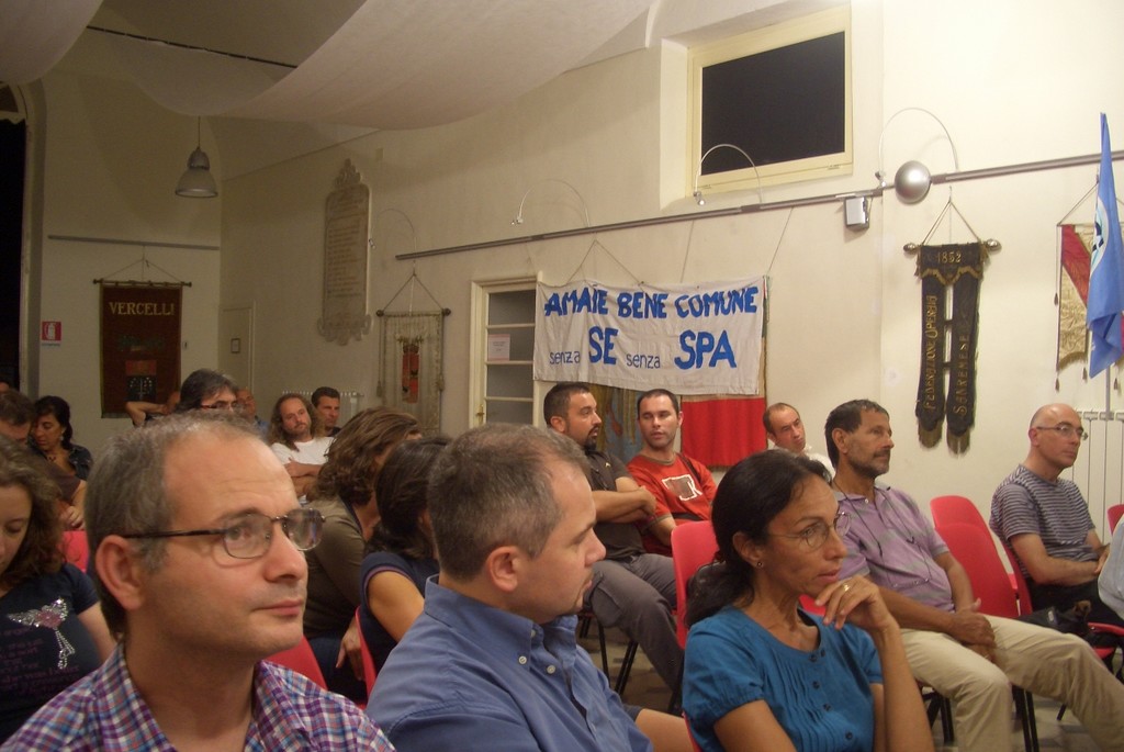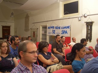 In sala spiccava il contrasto tra la partecipazione di lavoratori dell'AMAIE e l'assenza (da molti sottolineata) dei vertici della stessa azienda. Così come è stato istruttivo constatare che dopo l'incontro 'prontamente' organizzato il 27 giugno per sostenere che la via della privatizzazione dei servizi pubblici locali doveva continuare, Confindustria abbia deciso di non venire ad ascoltare le proposte dei movimenti per l'acqua su come finanziare la gestione del servizio idrico.